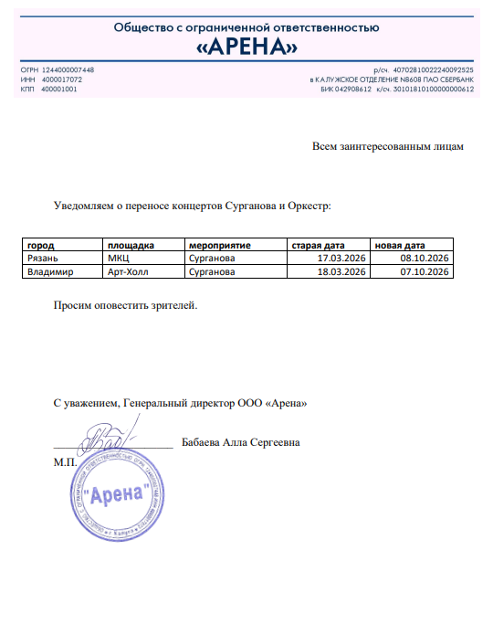 Уважаемый клиент! Спешим сообщить, что по информации, полученной от организатора, концерт группы «Сурганова и Оркестр», запланированный на 17 марта 2026 года в 19:00 в МКЦ «Рязань», перенесён на 8 октября 2026 года, начало в 19:00. Ранее приобретенные билеты действительны на новую дату, обменивать их не нужно. Если вам не удобно посетить концерт в новую дату, вы можете вернуть билет по кнопке в личном кабинете во вкладке «Заказы». Деньги за электронные билеты вернутся автоматически в полном объёме на карту, с которой была произведена оплата. Если вы купили билет в кассе Ticketland.ru за наличный расчет, то обратитесь, пожалуйста, на почту: vozvrat@ticketland.ru. С уважением, команда поддержки Ticketland.