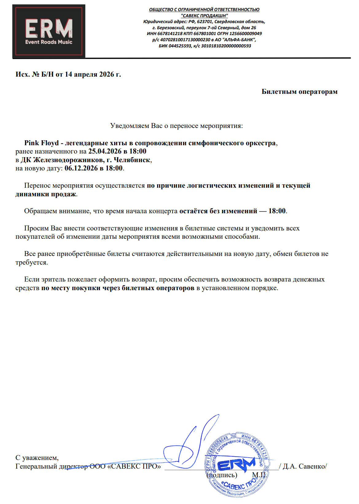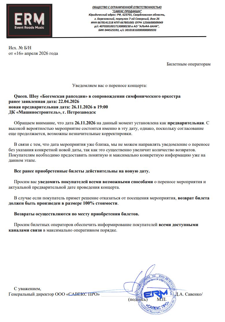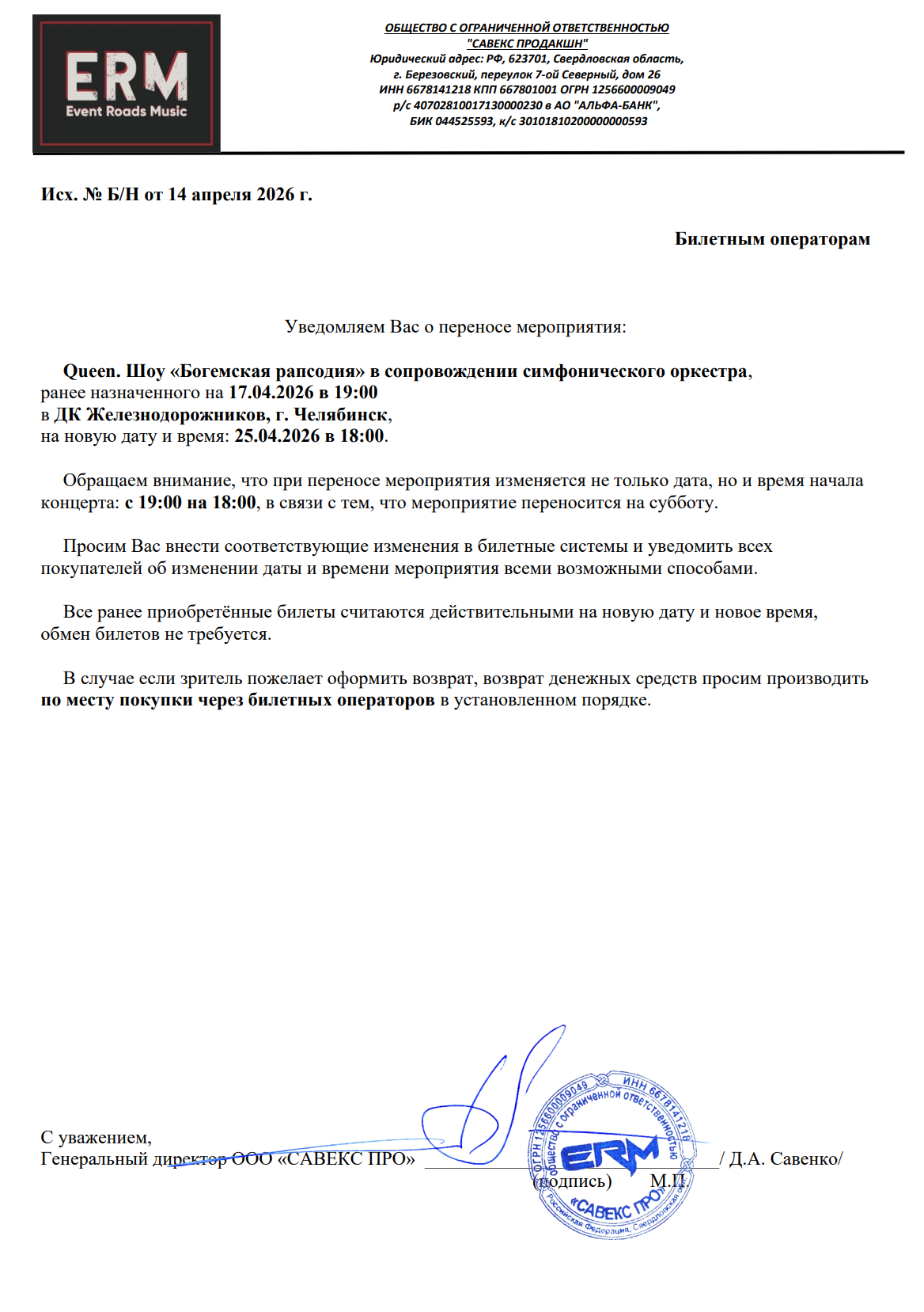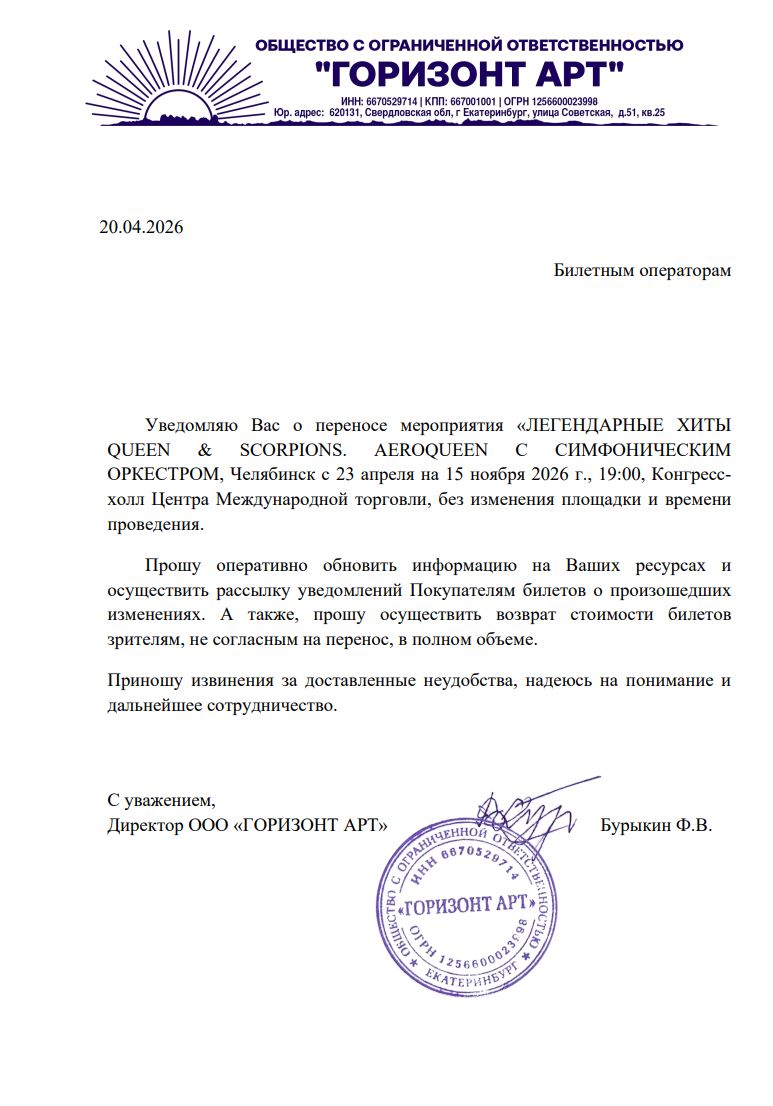 Уважаемый клиент! Спешим сообщить, что по информации, полученной от организатора, концерт «Легендарные хиты Queen & Scorpions. Aeroqueen с симфоническим оркестром», запланированный на 23 апреля 2026 года в 19:00 в Конгресс-холле Центра международной торговли (Челябинск), перенесён на 15 ноября 2026, начало в 19:00. Ранее приобретенные билеты действительны на новую дату, обменивать их не нужно. Если вам неудобно посетить концерт в новую дату, вы можете вернуть билет по кнопке в личном кабинете во вкладке «Заказы». Деньги за электронные билеты вернутся автоматически в полном объёме на карту, с которой была произведена оплата. Если вы купили билет в кассе Ticketland.ru за наличный расчет или оплатили подарочной картой, то обратитесь, пожалуйста, на почту: vozvrat@ticketland.ru. С уважением, команда поддержки Ticketland.