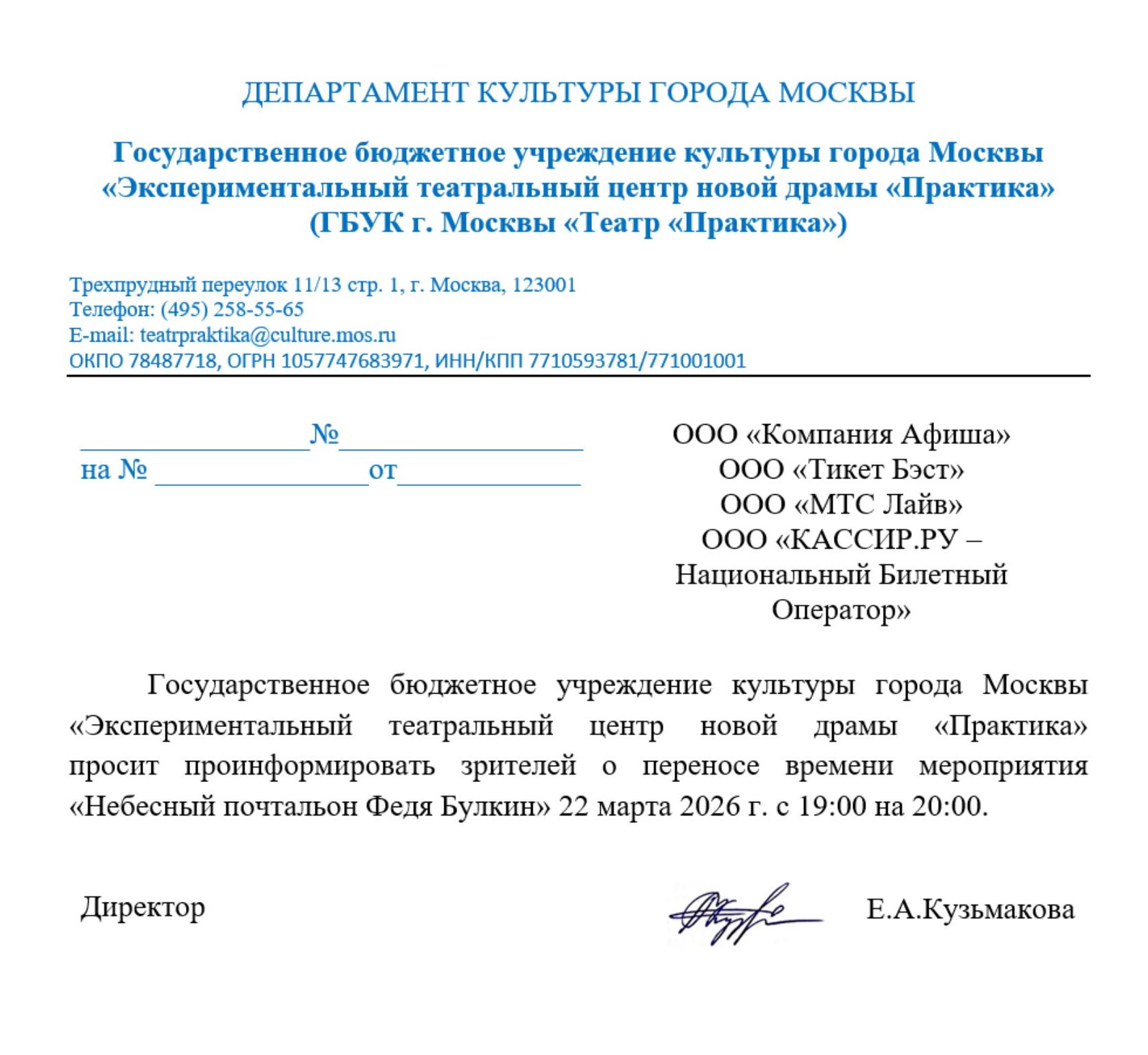 Уважаемый клиент! Спешим сообщить, что по информации, полученной от организатора, спектакль «Небесный почтальон Федя Булкин», запланированный на 22 марта 2026 года в 19:00 в Театре «Практика», перенесён на один час вперёд. Верное время начала спектакля - в 20:00. Ранее приобретенные билеты действительны на новое время, обменивать их не нужно. Если новое время спектакля вам не подходит, вы можете вернуть билет по кнопке в личном кабинете во вкладке «Заказы». Деньги за электронные билеты вернутся автоматически в полном объёме на карту, с которой была произведена оплата. Если вы купили билет в кассе Ticketland.ru за наличный расчет, то обратитесь, пожалуйста, на почту: vozvrat@ticketland.ru. С уважением, команда поддержки Ticketland.