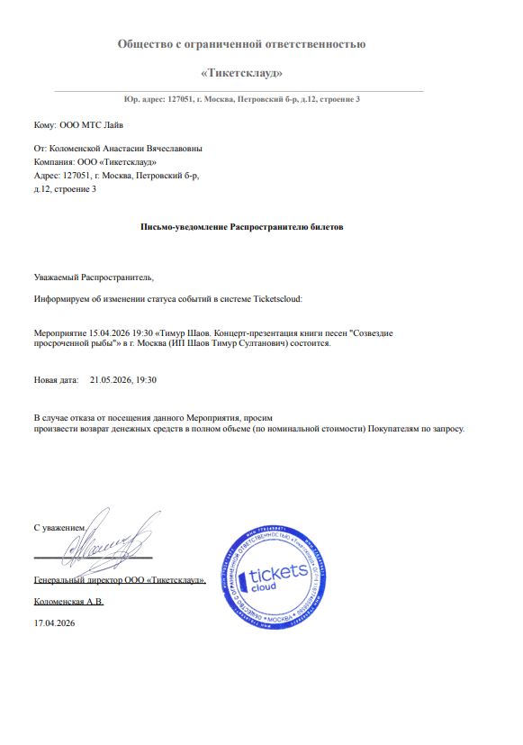 Уважаемый клиент! Спешим сообщить, что по информации, полученной от организатора, концерт Тимура Шаова и презентация книги песен «Созвездие просроченной рыбы», запланированный на 15 апреля 2026 года в 19:30 в ресторане «Петрович», перенесён на 21 мая 2026 года, начало в 19:30. Ранее приобретенные билеты действительны на новую дату, обменивать их не нужно. Если вам неудобно посетить концерт в новую дату, вы можете вернуть билет по кнопке в личном кабинете во вкладке «Заказы». Деньги за электронные билеты вернутся автоматически в полном объёме на карту, с которой была произведена оплата. Если вы купили билет в кассе Ticketland.ru за наличный расчет, то обратитесь, пожалуйста, на почту: vozvrat@ticketland.ru. С уважением, команда поддержки Ticketland.