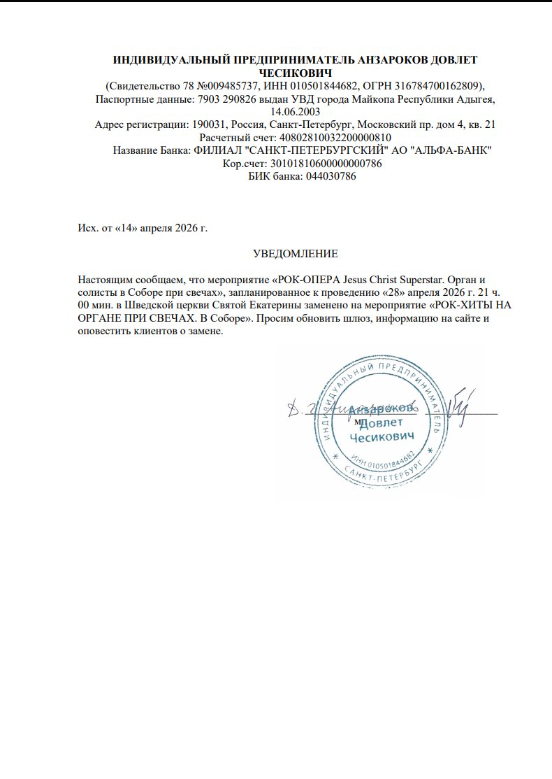 Уважаемый клиент! Спешим сообщить, что по информации, полученной от организатора, концерт «Орган и космос. Музыка И.С. Баха с видеопроекциями», запланированный на 20.05.202619.00, перенесён на 18 июня 2026 в 19:00 в Доме музыки. Ранее приобретенные билеты действительны на новую дату, обменивать их не нужно. Если вам неудобно посетить концерт в новую дату, вы можете вернуть билет по кнопке в личном кабинете во вкладке «Заказы» (до 2026-05-30 19:00). Деньги за электронные билеты вернутся автоматически в полном объёме на карту, с которой была произведена оплата. Если вы купили билет в кассе Ticketland.ru за наличный расчет, то обратитесь, пожалуйста, на почту: vozvrat@ticketland.ru. С уважением, команда поддержки Ticketland.