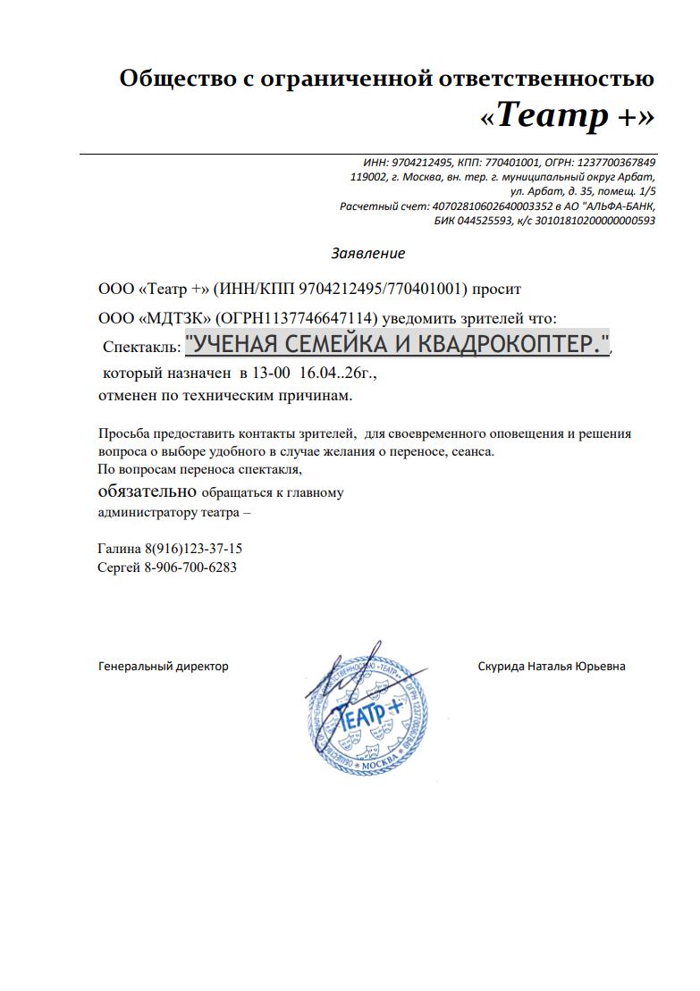 Уважаемый клиент! Спешим сообщить, что по информации, полученной от организатора, спектакль «Наследник», запланированный на 23 апреля 2026 года в 19:00 в Новосибирском Доме ученых СО РАН (Академгородок), отменен. Деньги за электронные билеты вернутся автоматически в полном объёме на карту, с которой была произведена оплата. Если вы купили билет в кассе Ticketland.ru за наличный расчет или оплатили подарочной картой, то обратитесь, пожалуйста, на почту: vozvrat@ticketland.ru. С уважением, команда поддержки Ticketland.