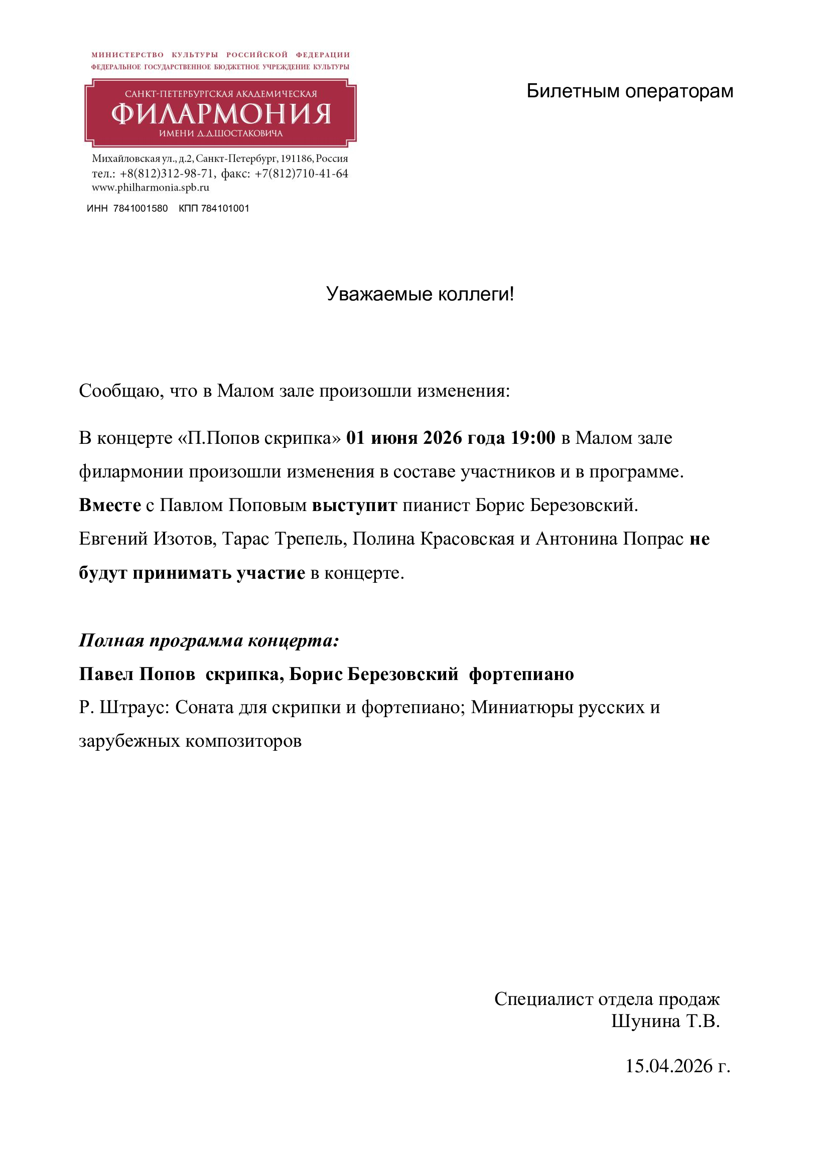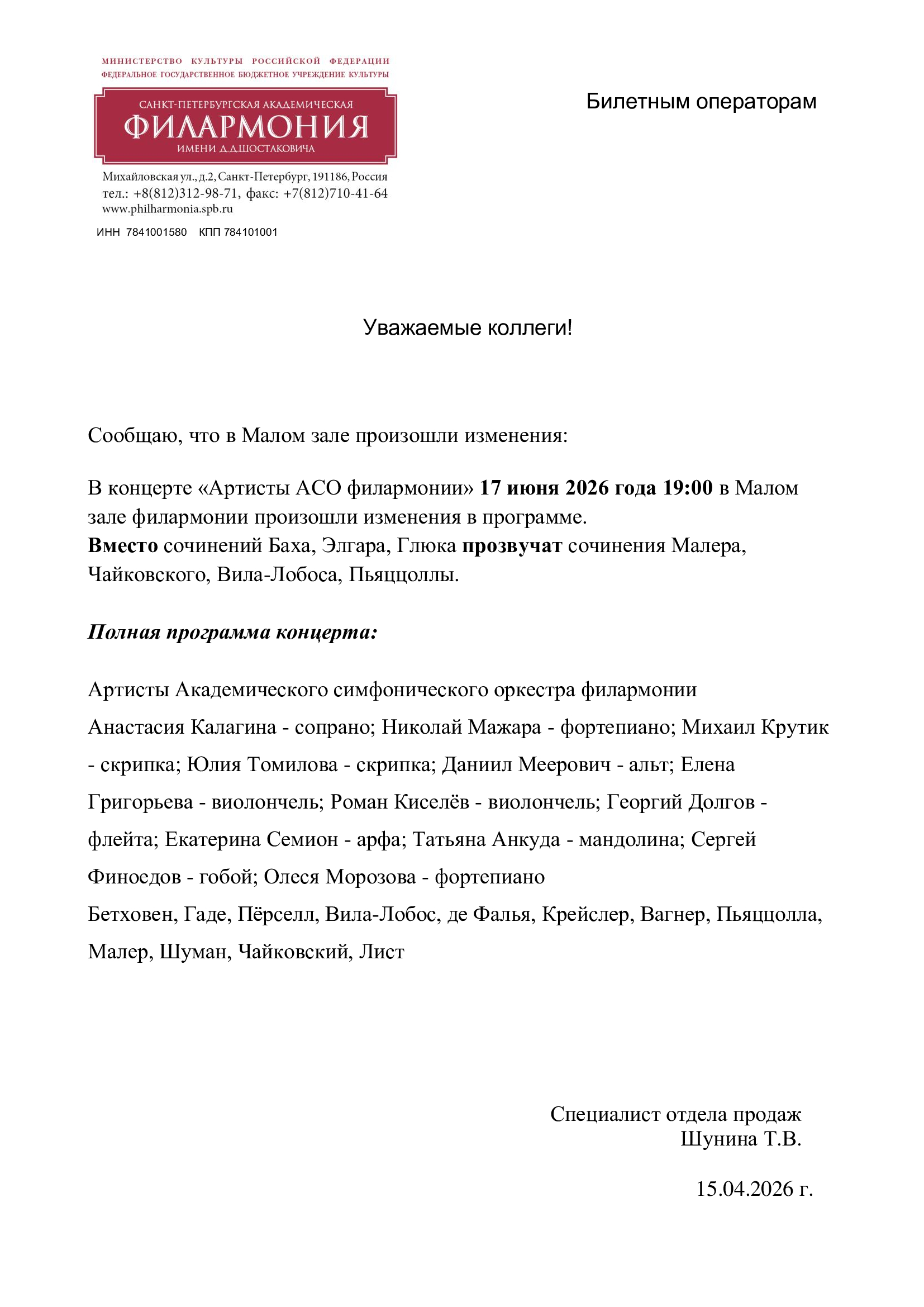 Уважаемый клиент! Спешим сообщить, что по информации, полученной от организатора, концерт «Шедевры барокко. Арии из опер», запланированный на 7 ноября 2025 года в 19:00 в Соборной палате ПСТГУ, перенесён на 15 апреля 2026 года, начало в 19:00. Ранее приобретенные билеты действительны на новую дату, обменивать их не нужно. Если вам не удобно посетить концерт в новую дату, вы можете вернуть билет по кнопке в личном кабинете во вкладке «Заказы» (до 10 ноября 2025 года включительно). Деньги за электронные билеты вернутся автоматически в полном объёме на карту, с которой была произведена оплата. Если вы купили билет в кассе Ticketland.ru за наличный расчет, то обратитесь, пожалуйста, на почту: vozvrat@ticketland.ru. С уважением, команда поддержки Ticketland.