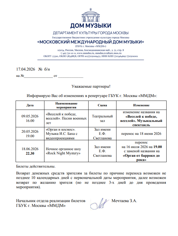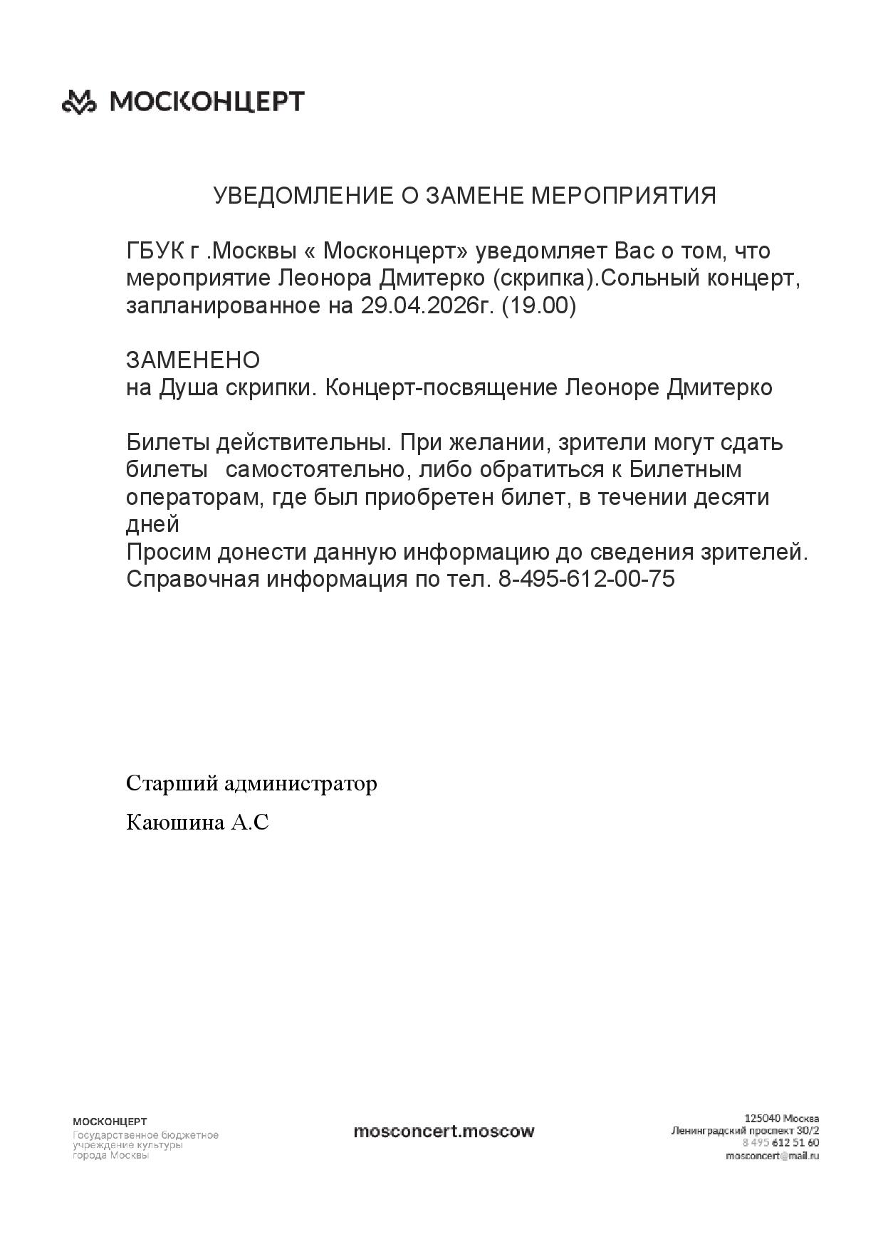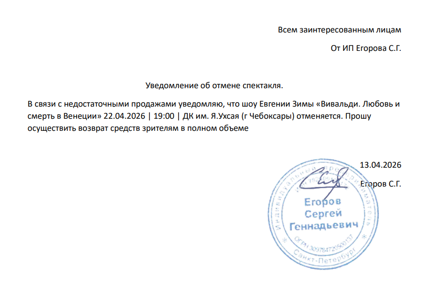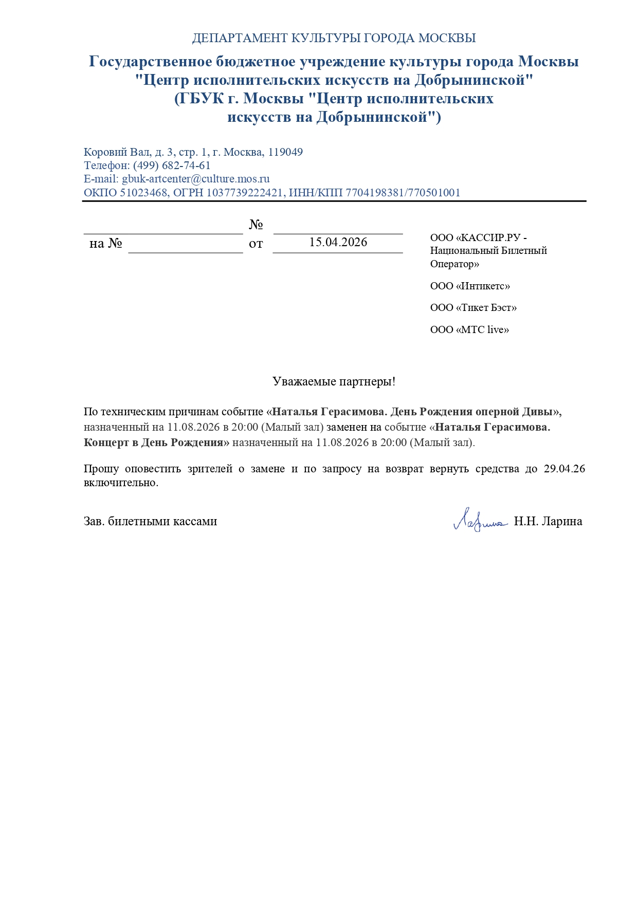 Уважаемый клиент! Спешим сообщить, что по информации, полученной от организатора, у концерта Натальи Герасимовой «День Рождения оперной Дивы» запланированного на 11 августа 2026 года в 20:00 в центре исполнительных искусств, заменено название на концерт в день рождения Натальи Герасимовой. Ранее приобретенные билеты действительны, обменивать их не нужно Если вы не хотите посетить мероприятие, вернуть билет можно по кнопке в личном кабинете во вкладке «Заказы» (до 29.04.2026г.). Деньги за электронные билеты вернутся автоматически в полном объёме на карту, с которой была произведена оплата. Если вы купили билет в кассе Ticketland.ru за наличный расчет или оплатили подарочной картой , то обратитесь, пожалуйста, на почту: vozvrat@ticketland.ru. С уважением, команда поддержки Ticketland