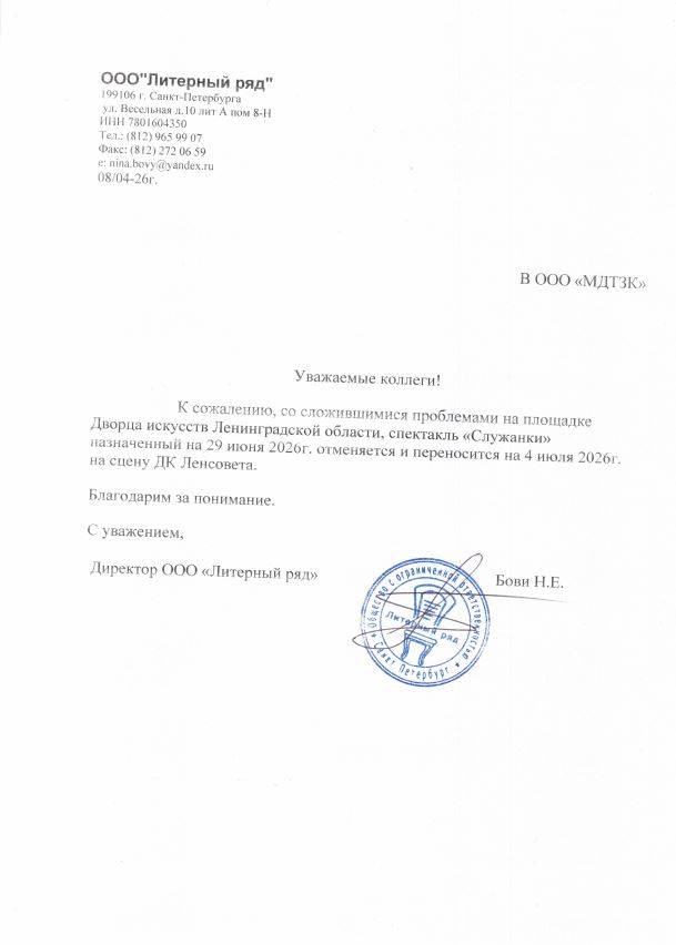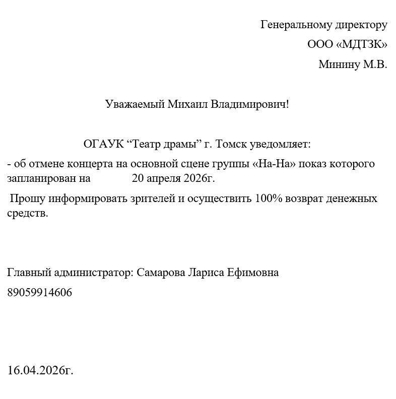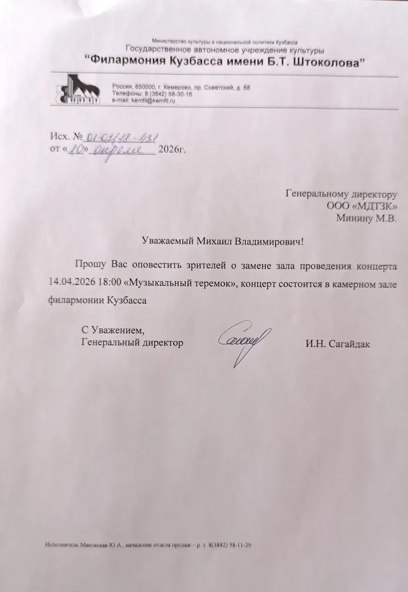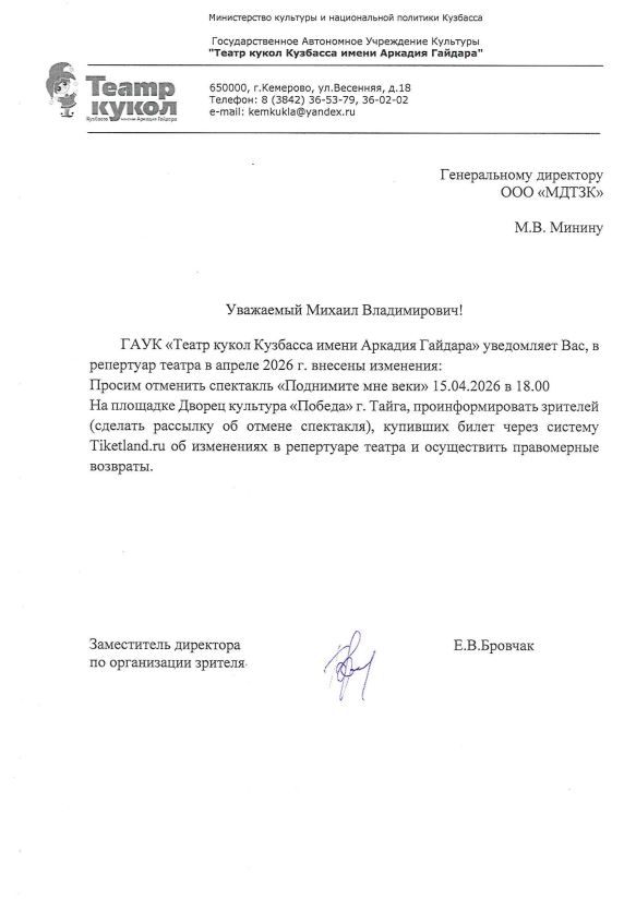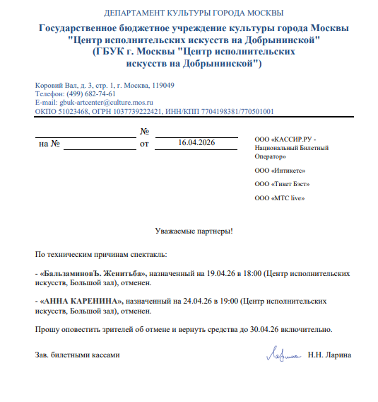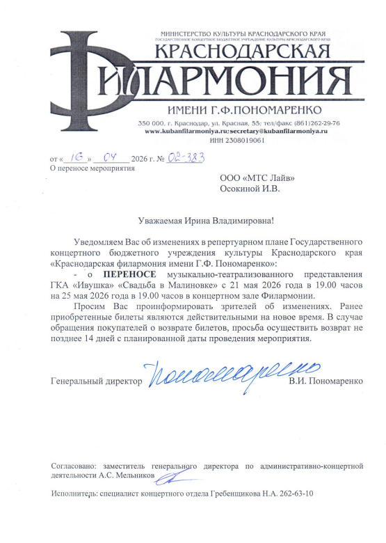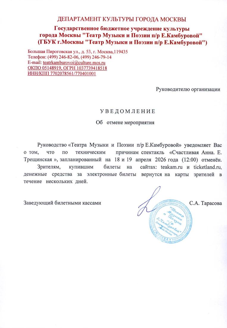 Уважаемый клиент! Спешим сообщить, что по информации, полученной от организатора, у концерта Натальи Герасимовой «День Рождения оперной Дивы» запланированного на 11 августа 2026 года в 20:00 в центре исполнительных искусств, заменено название на концерт в день рождения Натальи Герасимовой. Ранее приобретенные билеты действительны, обменивать их не нужно Если вы не хотите посетить мероприятие, вернуть билет можно по кнопке в личном кабинете во вкладке «Заказы» (до 29.04.2026г.). Деньги за электронные билеты вернутся автоматически в полном объёме на карту, с которой была произведена оплата. Если вы купили билет в кассе Ticketland.ru за наличный расчет или оплатили подарочной картой , то обратитесь, пожалуйста, на почту: vozvrat@ticketland.ru. С уважением, команда поддержки Ticketland