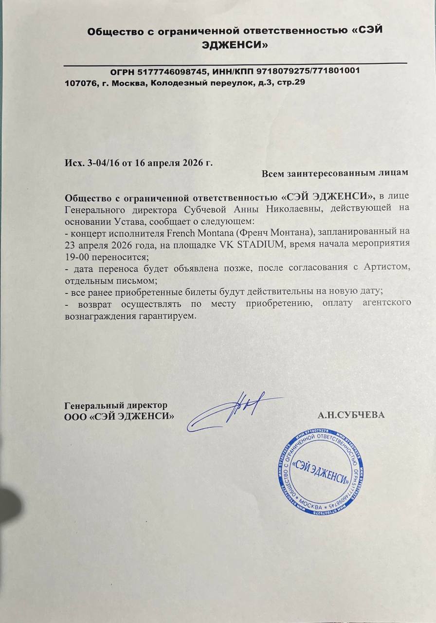 Уважаемый клиент! Спешим сообщить, что по информации, полученной от организатора, концерт French Montana, запланированный на 23 апреля 2026 года в VK Stadium, перенесен. Дата переноса будет объявлена позже. Ранее приобретенные билеты действительны на новую дату, обменивать их не нужно. Если вам не удобно посетить мероприятие в новую дату, вы можете вернуть билет по кнопке в личном кабинете во вкладке «Заказы». Деньги за электронные билеты вернутся автоматически в полном объёме на карту, с которой была произведена оплата. Если вы купили билет в кассе Ticketland.ru за наличный расчет, то обратитесь, пожалуйста, на почту: vozvrat@ticketland.ru. С уважением, команда поддержки Ticketland