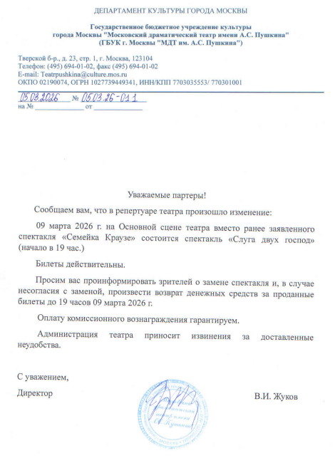 Уважаемый клиент! Спешим сообщить, что по информации, полученной от организатора, спектакль «Семейка Краузе» запланированный на 9 марта 2026 года в 19:00 в Театре им. А. С. Пушкина, заменен на спектакль «Слуга двух господ». Ранее приобретенные билеты действительны, обменивать их не нужно. Если вы не хотите посетить новое мероприятие, вернуть билет можно по кнопке в личном кабинете во вкладке «Заказы»(до 9 марта 2026 года 19:00). Деньги за электронные билеты вернутся автоматически в полном объёме на карту, с которой была произведена оплата. Если вы купили билет в кассе Ticketland.ru за наличный расчет, то обратитесь, пожалуйста, на почту: vozvrat@ticketland.ru. С уважением, команда поддержки Ticketland