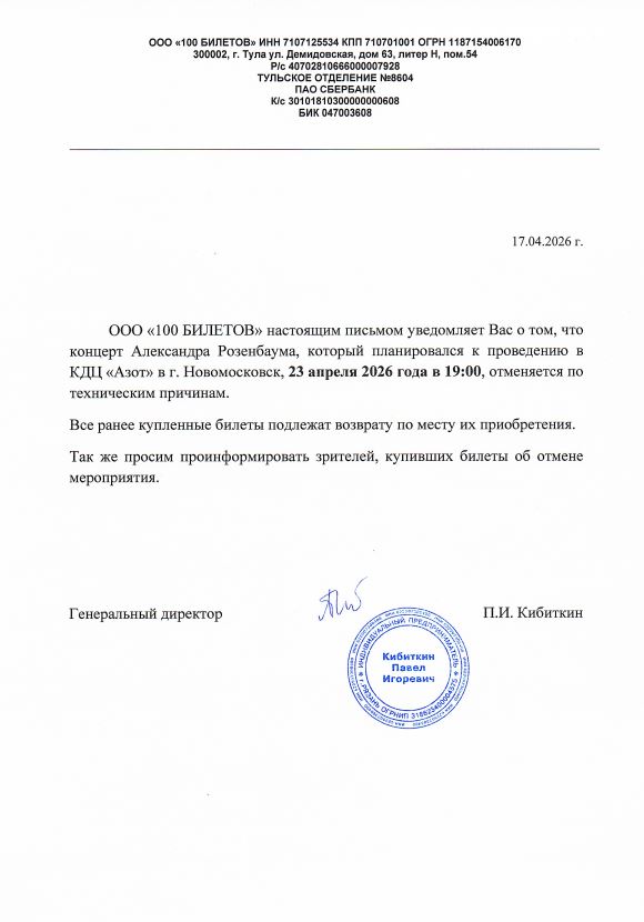 Уважаемый клиент! Спешим сообщить, что по информации, полученной от организатора, концерт Александра Розенбаума, запланированный на 23 апреля 2026 года в 19:00 в КДЦ «АЗОТ» (г. Новомосковск), отменён. Деньги за электронные билеты вернутся автоматически в полном объёме на карту, с которой была произведена оплата. Если вы купили билет в кассе Ticketland.ru за наличный расчет или оплатили подарочной картой, то обратитесь, пожалуйста, на почту: vozvrat@ticketland.ru. С уважением, команда поддержки Ticketland.