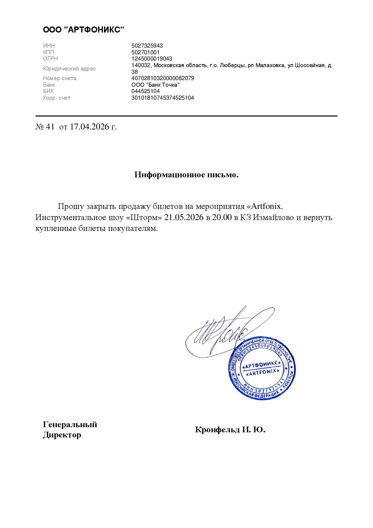 Уважаемый клиент! Спешим сообщить, что по информации, полученной от организатора, инструментальное шоу Artfonix «Шторм», запланированное на 21 мая 2026 года в 20:00 в КЗ «Измайлово», отменено. Деньги за электронные билеты вернутся автоматически в полном объёме на карту, с которой была произведена оплата. Если вы купили билет в кассе Ticketland.ru за наличный расчет или оплатили подарочной картой, то обратитесь, пожалуйста, на почту: vozvrat@ticketland.ru. С уважением, команда поддержки Ticketland.