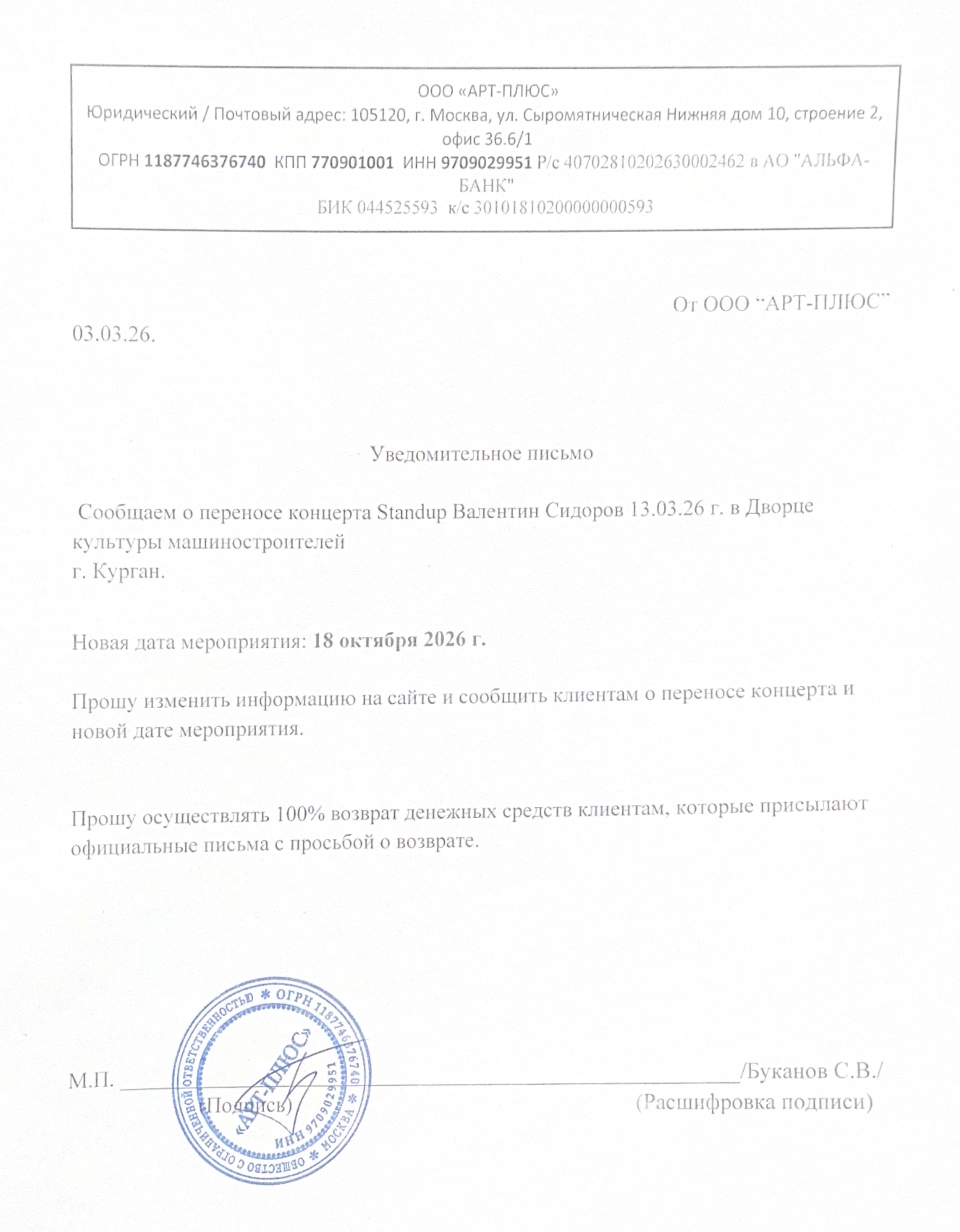Уважаемый клиент! Спешим сообщить, что по информации, полученной от организатора, StandUp концерт Валентина Сидорова, запланированный на 13 марта 2026 года в 19:00 во Дворце культуры машиностроителей, перенесён на 18 октября 2026 года, начало в 19:00. Ранее приобретенные билеты действительны на новую дату, обменивать их не нужно. Если вам не удобно посетить концерт в новую дату, вы можете вернуть билет по кнопке в личном кабинете во вкладке «Заказы» (до 30 апреля 2026 года включительно). Деньги за электронные билеты вернутся автоматически в полном объёме на карту, с которой была произведена оплата. Если вы купили билет в кассе Ticketland.ru за наличный расчет, то обратитесь, пожалуйста, на почту: vozvrat@ticketland.ru. С уважением, команда поддержки Ticketland.
