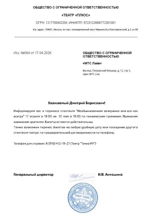 Уважаемый клиент! Спешим сообщить, что по информации, полученной от организатора, спектакль «Митина любовь», запланированный на 17 апреля 2026 года в 19:00 в театре на Таганке, перенесён на 23 июня 2026 года в 19:00. Ранее приобретенные билеты действительны на новую дату, обменивать их не нужно. Если вам не удобно посетить мероприятие в новую дату, вы можете вернуть билет по кнопке в личном кабинете во вкладке «Заказы». Деньги за электронные билеты вернутся автоматически в полном объёме на карту, с которой была произведена оплата. Если вы купили билет в кассе Ticketland.ru за наличный расчет или оплатили подарочной картой, то обратитесь, пожалуйста, на почту: vozvrat@ticketland.ru. С уважением, команда поддержки Ticketland
