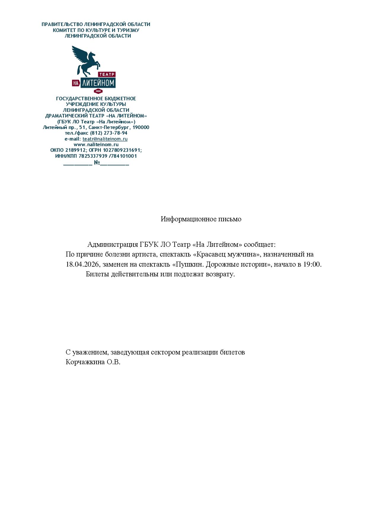 Уважаемый клиент! Спешим сообщить, что по информации, полученной от организатора, спектакль «Красавец мужчина», запланированный на 18 апреля 2026 года в 19:00 в Драматическом театре «На Литейном», заменён на спектакль «Пушкин. Дорожные истории». Ранее приобретенные билеты действительны на новый спектакль, обменивать их не нужно. Если вам не удобно посетить новый спектакль, вернуть билет можно по кнопке в личном кабинете во вкладке «Заказы» (до начала мероприятия). Деньги за электронные билеты вернутся автоматически в полном объёме на карту, с которой была произведена оплата. Если вы купили билет в кассе Ticketland.ru за наличный расчет или оплатили подарочной картой, то обратитесь, пожалуйста, на почту: vozvrat@ticketland.ru. С уважением, команда поддержки Ticketland.