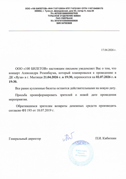 Уважаемый клиент! Спешим сообщить, что по информации, полученной от организатора, концерт Александра Розенбаума, запланированный на 21 апреля 2026 года в 18:00 в ДК «Яуза», перенесён на 2 июля 2026 года, начало в 19:30. Ранее приобретенные билеты действительны на новую дату, обменивать их не нужно. Если вам неудобно посетить концерт в новую дату, вы можете вернуть билет по кнопке в личном кабинете во вкладке «Заказы». Деньги за электронные билеты вернутся автоматически в полном объёме на карту, с которой была произведена оплата. Если вы купили билет в кассе Ticketland.ru за наличный расчет, то обратитесь, пожалуйста, на почту: vozvrat@ticketland.ru. С уважением, команда поддержки Ticketland.
