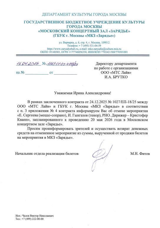 Уважаемый клиент! Спешим сообщить, что по информации, полученной от организатора, концерт Е. Сергеевой, И. Гынгазова, РНО. Дирижер – Кристофер Кнапп, запланированный на 20 мая 2026 года в 19:00 в МКЗ «Зарядье», отменен. Деньги за электронные билеты вернутся автоматически в полном объёме на карту, с которой была произведена оплата. Если вы купили билет в кассе Ticketland.ru за наличный расчет или оплатили подарочной картой, то обратитесь, пожалуйста, на почту: vozvrat@ticketland.ru. С уважением, команда поддержки Ticketland.