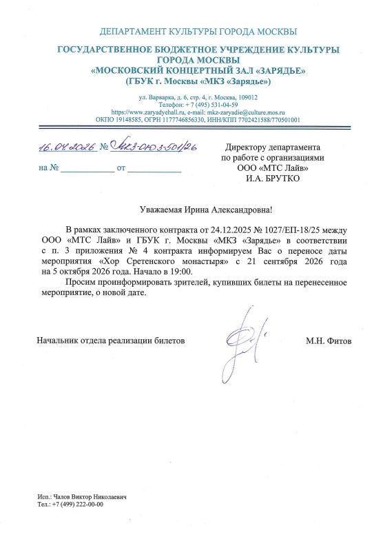 Уважаемый клиент! Спешим сообщить, что по информации, полученной от организатора, концерт «Хор Сретенского монастыря», запланированный на 21 сентября 2026 года в 19:00 в МКЗ «Зарядье», перенесен на 5 октября 2026 года, начало в 19:00. Если вам не удобно посетить мероприятие в новую дату, вы можете вернуть билет по кнопке в личном кабинете во вкладке «Заказы» (до 31 мая 2026 года включительно). Деньги за электронные билеты вернутся автоматически в полном объёме на карту, с которой была произведена оплата. Если вы купили билет в кассе Ticketland.ru за наличный расчет за наличный расчет или оплатили подарочной картой , то обратитесь, пожалуйста, на почту: vozvrat@ticketland.ru. С уважением, команда поддержки Ticketland.