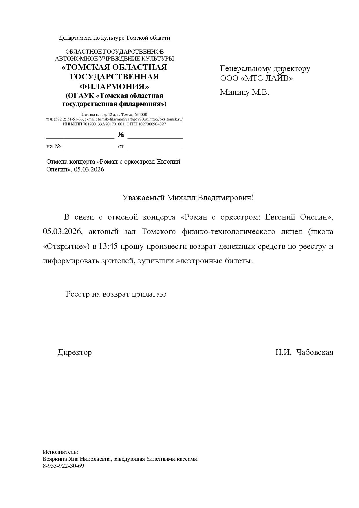 Уважаемый клиент! Спешим сообщить, что по информации, полученной от организатора, концерт «Роман с оркестром: Евгений Онегин», запланированный на 5 марта 2026 года в 13:45 в Томском физико-технический лицее, отменён. Деньги за электронные билеты вернутся автоматически в полном объёме на карту, с которой была произведена оплата. Если вы купили билет в кассе Ticketland.ru за наличный расчет, то обратитесь, пожалуйста, на почту: vozvrat@ticketland.ru. С уважением, команда поддержки Ticketland.