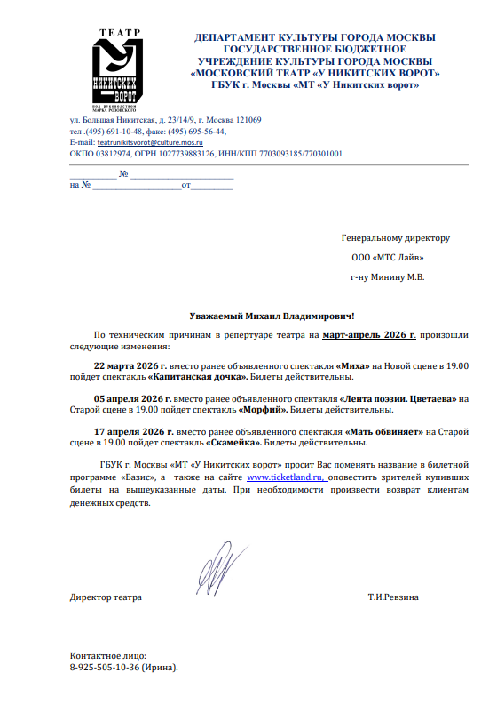 Уважаемый клиент! Спешим сообщить, что по информации, полученной от организатора, спектакль «Миха», запланированный на 22 марта 2026 года в 19:00 в театре «У Никитских ворот», заменён на спектакль «Капитанская дочка». Ранее приобретенные билеты действительны на новый спектакль, обменивать их не нужно. Если вам не удобно посетить новый спектакль, вы можете вернуть билет по кнопке в личном кабинете во вкладке «Заказы». Деньги за электронные билеты вернутся автоматически в полном объёме на карту, с которой была произведена оплата. Если вы купили билет в кассе Ticketland.ru за наличный расчет, то обратитесь, пожалуйста, на почту: vozvrat@ticketland.ru. С уважением, команда поддержки Ticketland.