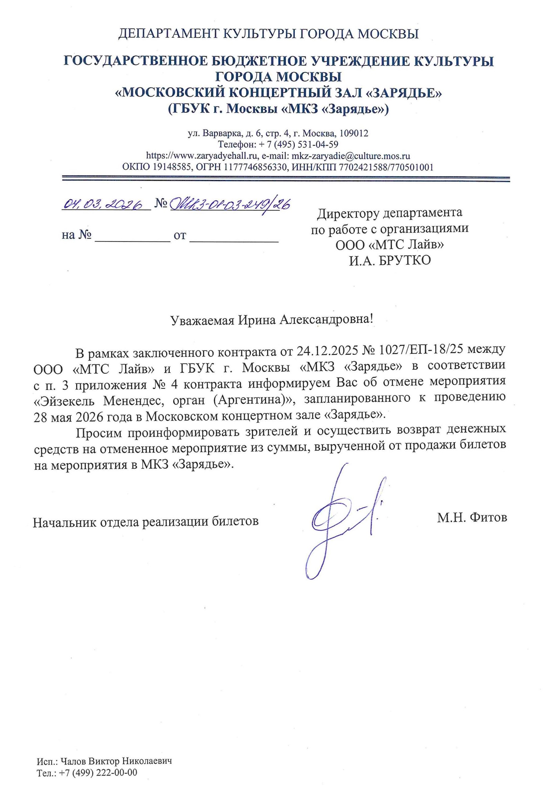 Уважаемый клиент! Спешим сообщить, что по информации, полученной от организатора, концерт Эйзекеля Менендеса (Аргентина), запланированный на 28 мая 2026 года в 19:00 в МКЗ «Зарядье», отменён. Деньги за электронные билеты вернутся автоматически в полном объёме на карту, с которой была произведена оплата. Если вы купили билет в кассе Ticketland.ru за наличный расчет, то обратитесь, пожалуйста, на почту: vozvrat@ticketland.ru. С уважением, команда поддержки Ticketland.