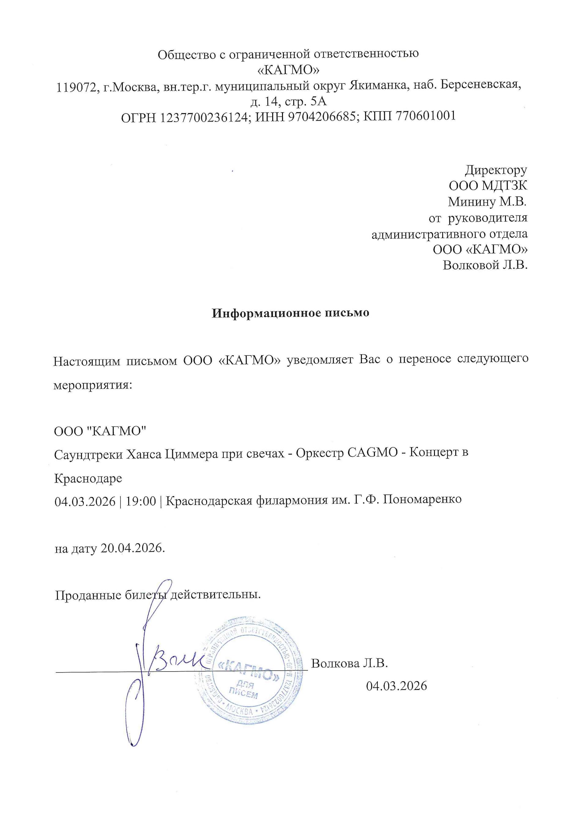 Уважаемый клиент! Спешим сообщить, что по информации, полученной от организатора, концерт «Оркестр CAGMO — Саундтреки Ханса Циммера при свечах», запланированный на 4 марта 2026 года в 19:00 в Краснодарской филармонии им. Пономаренко, перенесён на 20 апреля 2026 года, начало в 19:00. Ранее приобретенные билеты действительны на новую дату, обменивать их не нужно. Если вам не удобно посетить концерт в новую дату, вы можете вернуть билет по кнопке в личном кабинете во вкладке «Заказы» (до 31 марта 2026 года включительно). Деньги за электронные билеты вернутся автоматически в полном объёме на карту, с которой была произведена оплата. Если вы купили билет в кассе Ticketland.ru за наличный расчет, то обратитесь, пожалуйста, на почту: vozvrat@ticketland.ru. С уважением, команда поддержки Ticketland.