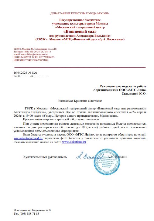 Уважаемый клиент! Спешим сообщить, что по информации, полученной от организатора, спектакль «Упырь. История одного происшествия», запланированный на 22 апреля 2026 года в 19:00 в МТЦ «Вишневый сад», отменен. Деньги за электронные билеты вернутся автоматически в полном объёме на карту, с которой была произведена оплата. Если вы купили билет в кассе Ticketland.ru за наличный расчет или оплатили подарочной картой, то обратитесь, пожалуйста, на почту: vozvrat@ticketland.ru. С уважением, команда поддержки Ticketland.