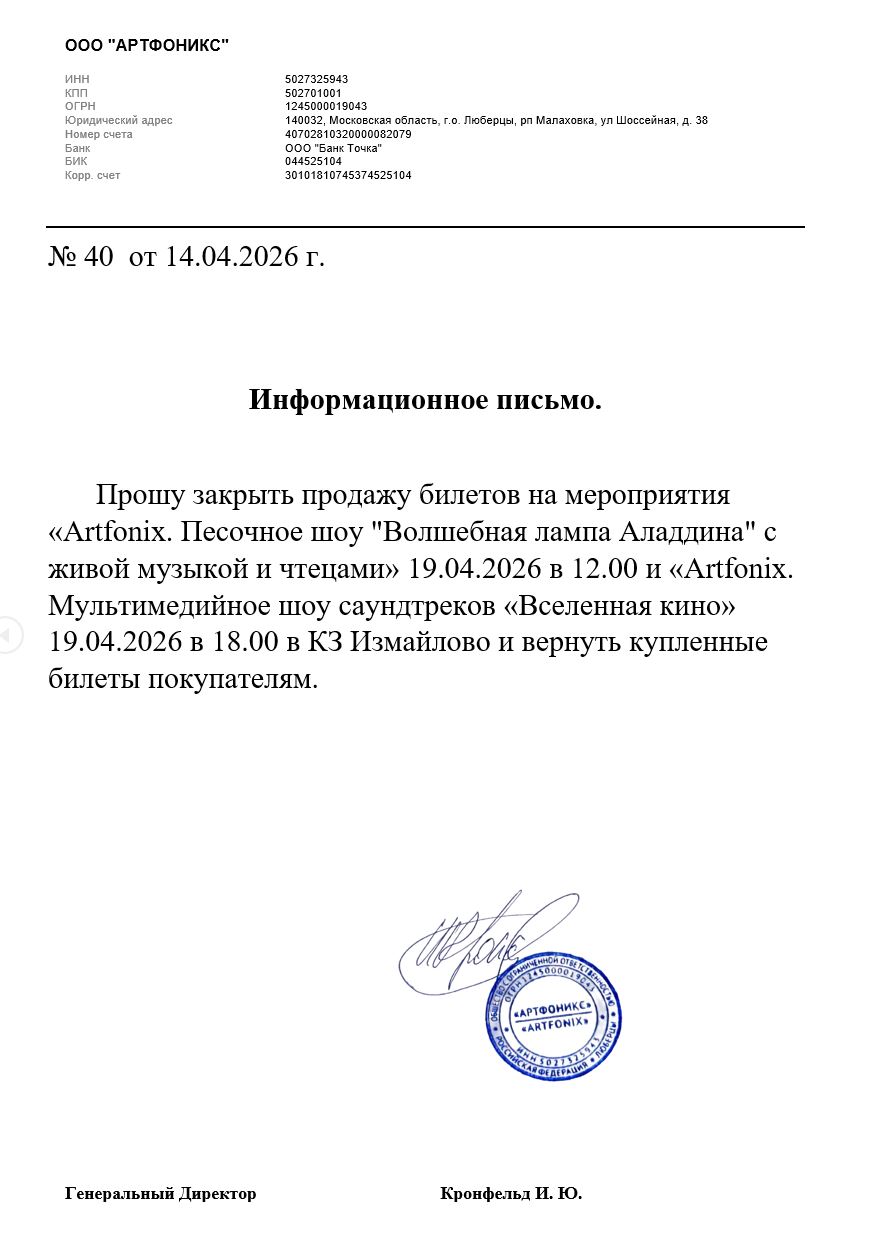 Уважаемый клиент! Спешим сообщить, что по информации, полученной от организатора, концерт «Artfonix. Песочное шоу «Сказки Пушкина» с живой музыкой и чтецом», запланированный на 31 мая 2026 года в 12:00 в КЗ «Измайлово», отменено. Деньги за электронные билеты вернутся автоматически в полном объёме на карту, с которой была произведена оплата. Если вы купили билет в кассе Ticketland.ru за наличный расчет или оплатили подарочной картой, то обратитесь, пожалуйста, на почту: vozvrat@ticketland.ru. С уважением, команда поддержки Ticketland.