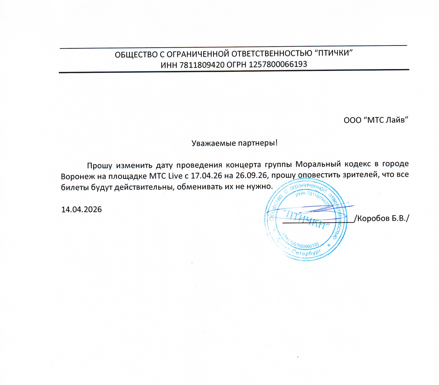 Уважаемый клиент! Спешим сообщить, что по информации, полученной от организатора, концерт Мona, запланированный на 19 ноября 2025 года в 20:00 в клубе «Метелица-С», перенесён на 26 мая 2026 года. Ранее приобретенные билеты действительны на новую дату, обменивать их не нужно. Если вам неудобно посетить концерт в новую дату, вы можете вернуть билет по кнопке в личном кабинете во вкладке «Заказы». Деньги за электронные билеты вернутся автоматически в полном объёме на карту, с которой была произведена оплата. Если вы купили билет в кассе Ticketland.ru за наличный расчет, то обратитесь, пожалуйста, на почту: vozvrat@ticketland.ru. Письмо от организатораС уважением, команда поддержки Ticketland.