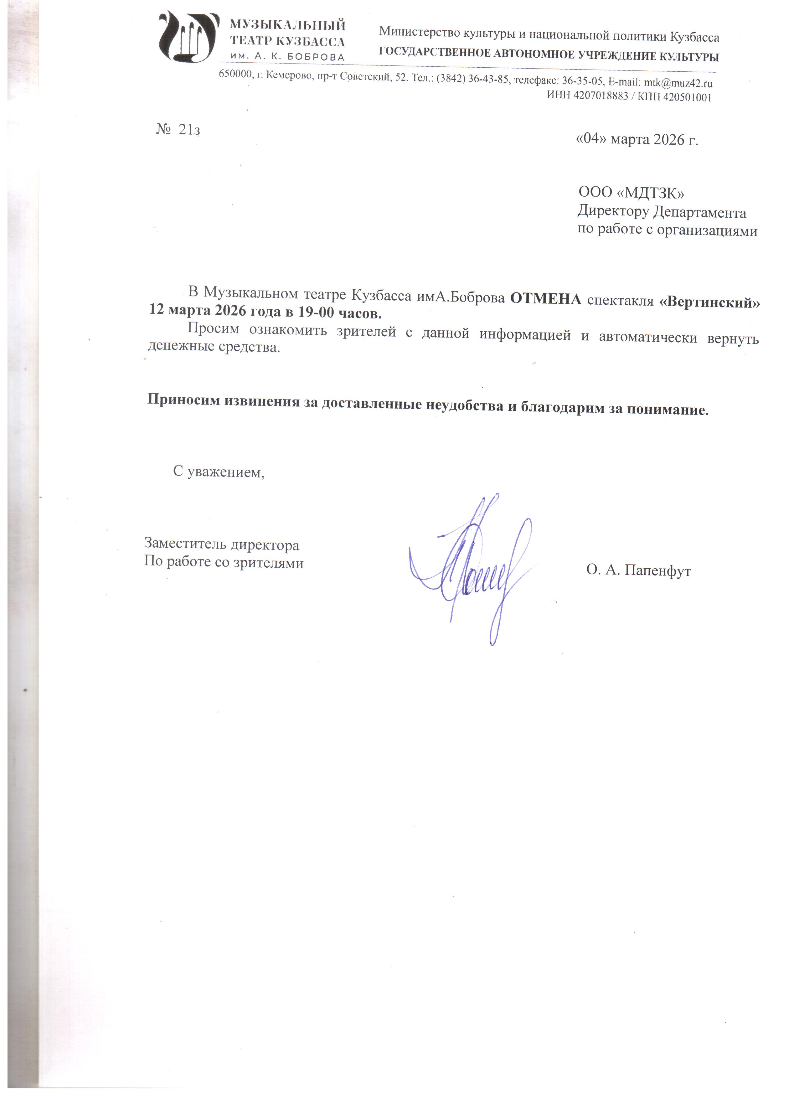 Уважаемый клиент! Спешим сообщить, что по информации, полученной от организатора, спектакль «Вертинский», запланированный на 12 марта 2026 года в 19:00 в Музыкальном театре Кузбасса им. Боброва, отменён. Деньги за электронные билеты вернутся автоматически в полном объёме на карту, с которой была произведена оплата. Если вы купили билет в кассе Ticketland.ru за наличный расчет, то обратитесь, пожалуйста, на почту: vozvrat@ticketland.ru. С уважением, команда поддержки Ticketland.