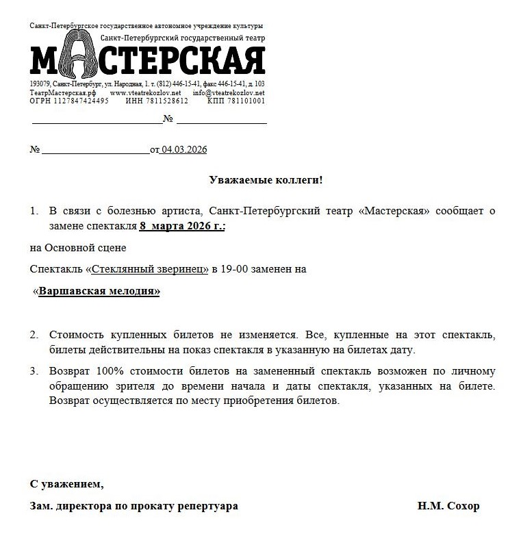 Уважаемый клиент! Спешим сообщить, что по информации, полученной от организатора, спектакль «Стеклянный зверинец», запланированный на 8 марта 2026 года в 19:00 в Театре «Мастерская» п/р Григория Козлова, заменён на спектакль «Варшавская мелодия». Ранее приобретенные билеты действительны на новый спектакль, обменивать их не нужно. Если вам не удобно посетить новый спектакль, вы можете вернуть билет по кнопке в личном кабинете во вкладке «Заказы». Деньги за электронные билеты вернутся автоматически в полном объёме на карту, с которой была произведена оплата. Если вы купили билет в кассе Ticketland.ru за наличный расчет, то обратитесь, пожалуйста, на почту: vozvrat@ticketland.ru. С уважением, команда поддержки Ticketland.