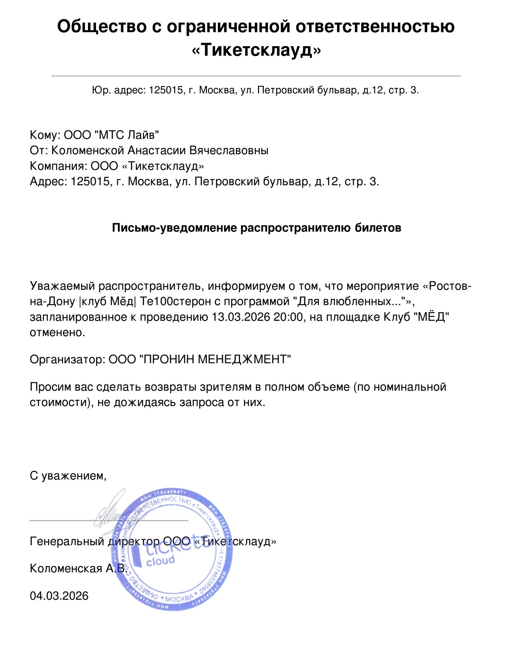 Уважаемый клиент! Спешим сообщить, что по информации, полученной от организатора, концерт группы «Те100стерон» с программой «Для влюбленных», запланированный на 13 марта 2026 года в 20:00 в клубе «Мёд», отменён. Деньги за электронные билеты вернутся автоматически в полном объёме на карту, с которой была произведена оплата. Если вы купили билет в кассе Ticketland.ru за наличный расчет, то обратитесь, пожалуйста, на почту: vozvrat@ticketland.ru. С уважением, команда поддержки Ticketland.