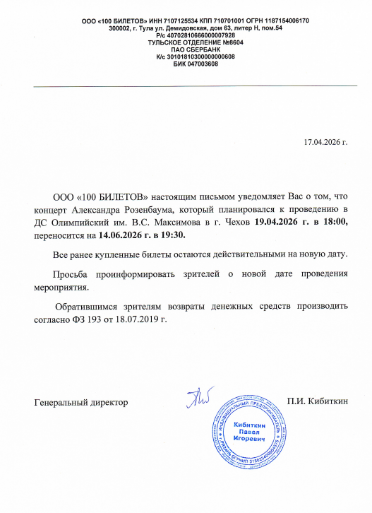 Уважаемый клиент! Спешим сообщить, что по информации, полученной от организатора, концерт Александра Розенбаума, запланированный на 19 апреля 2026 года в 18:00 в ДС «Олимпийский», перенесён на 14 июня 2026 года, начало в 19:30. Ранее приобретенные билеты действительны на новую дату, обменивать их не нужно. Если вам неудобно посетить концерт в новую дату, вы можете вернуть билет по кнопке в личном кабинете во вкладке «Заказы». Деньги за электронные билеты вернутся автоматически в полном объёме на карту, с которой была произведена оплата. Если вы купили билет в кассе Ticketland.ru за наличный расчет, то обратитесь, пожалуйста, на почту: vozvrat@ticketland.ru. С уважением, команда поддержки Ticketland.